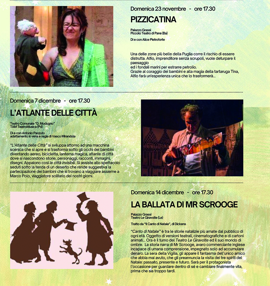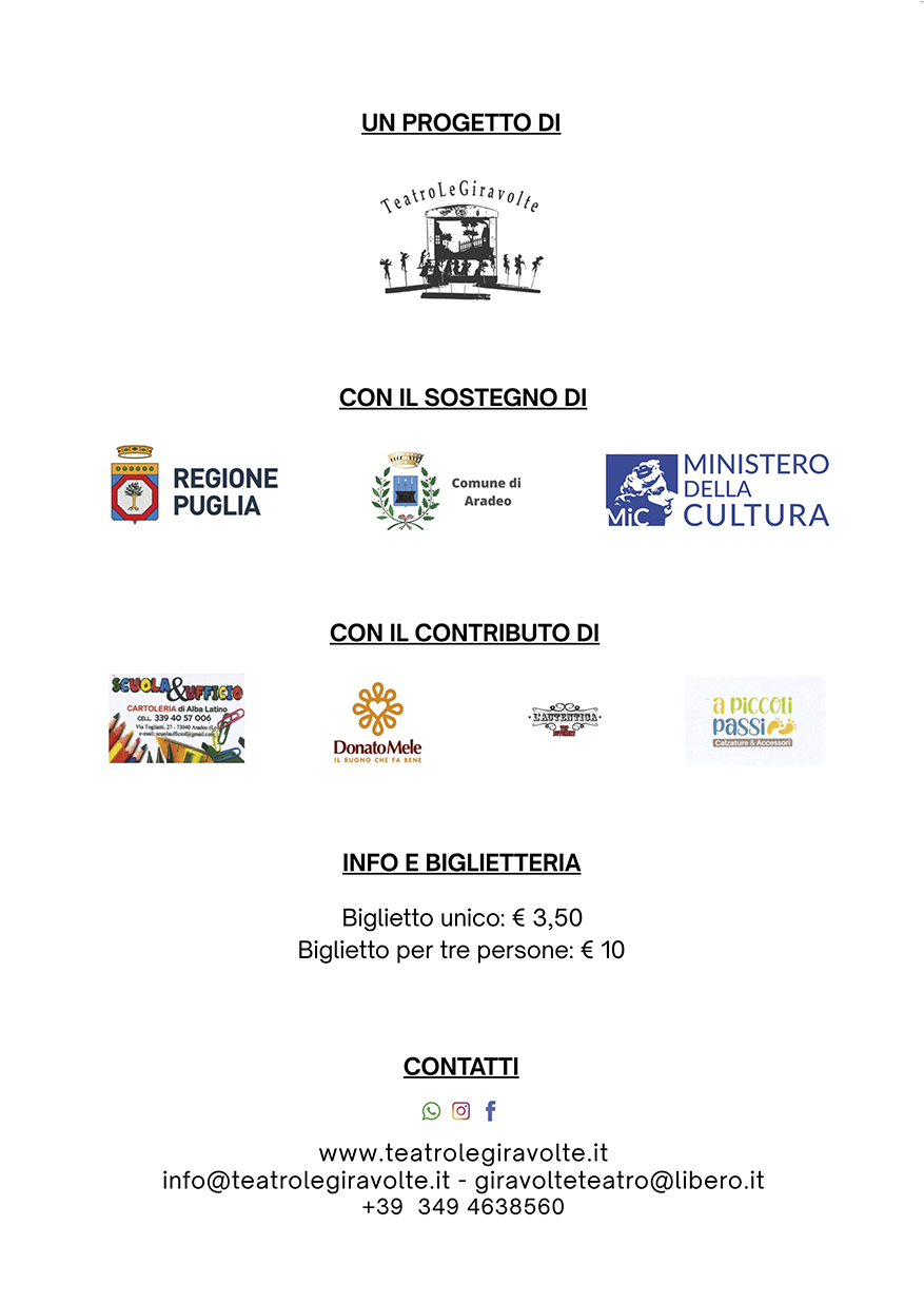 Ottobre-dicembre 2025 OPLA'...in SCENA Laboratorio teatrale per bambini Palazzo Grassi di AradeoIl classico laboratorio di animazione teatrale che prevede l'ideazione,la progettazione e la costruzione di una messa in scena teatrale. Per rendere più ricca e stimolante l’esperienza proponiamo la fiaba LA RAPA GIGANTE di Sharkey e Tolstoy, un piccolo testo che narra dell’avventura di due vecchietti, dei loro animali e di una rapa che non vuole saperne di essere sradicata dall’orto…