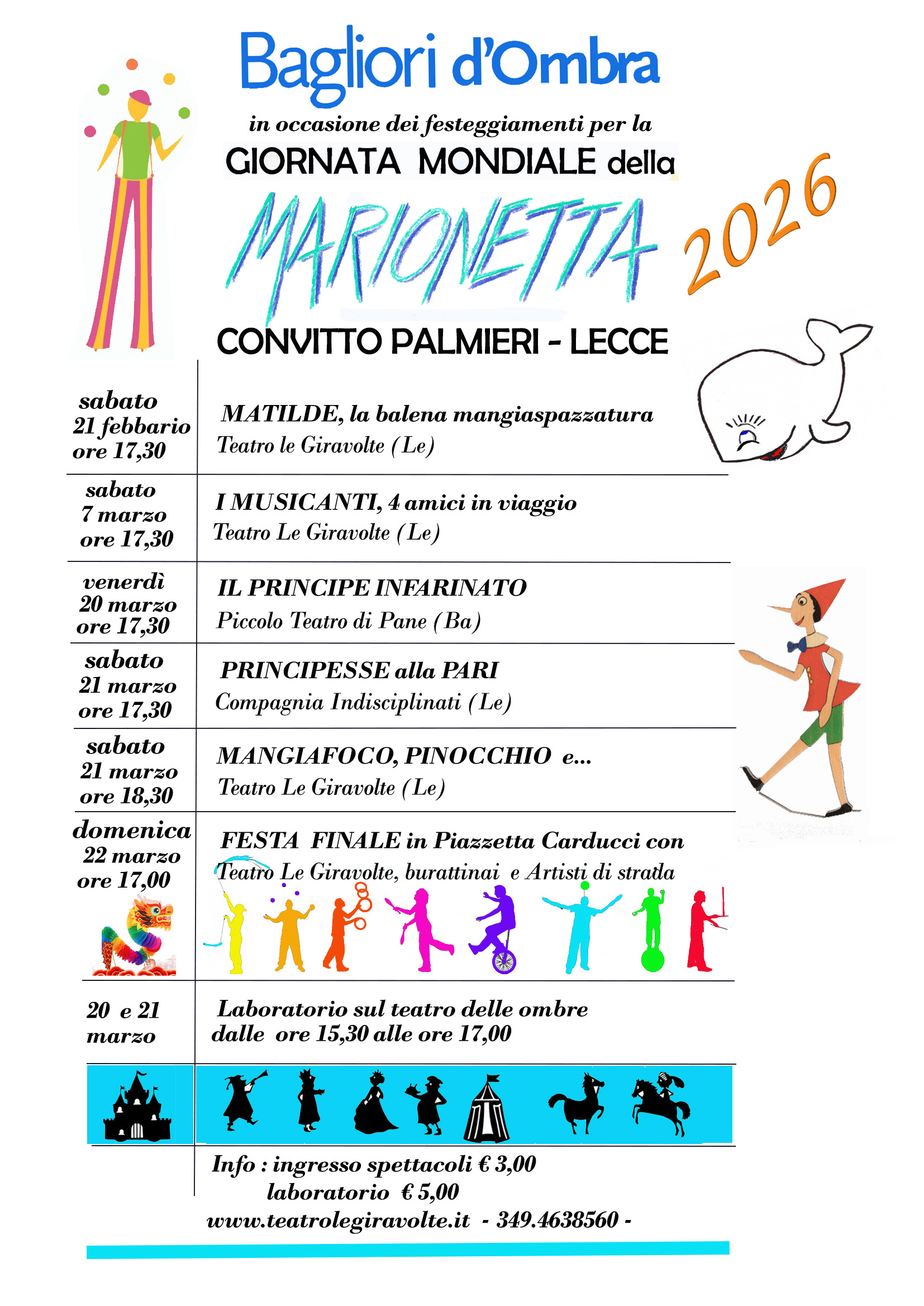 Il laboratorio si pone l’obiettivo di dare spazio e strumenti alla creatività e all’espressività del bambino potenziandone lo sviluppo e la libera crescita. Il teatro viene proposto come un momento di gioco dove più facilmente la fantasia e l’immaginario compaiono spontaneamente per giungere infine ad una più chiara definizione dei momenti creativi, simbolici, teatrali. Un campo di lavoro e di esperienza che offre un insieme di oggetti, situazioni, immagini e linguaggi capaci di stimolare verso apprendimenti sempre più sicuri. Il laboratorio porta avanti :
